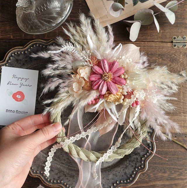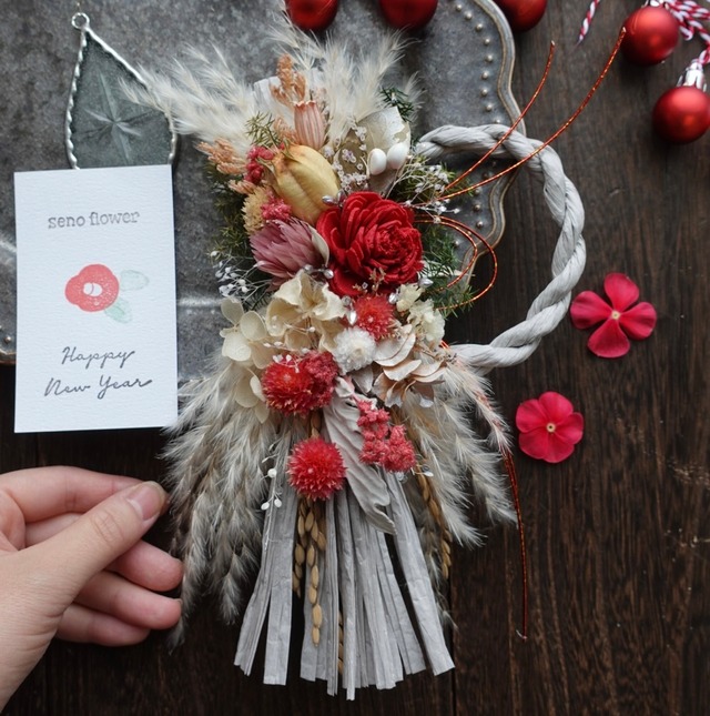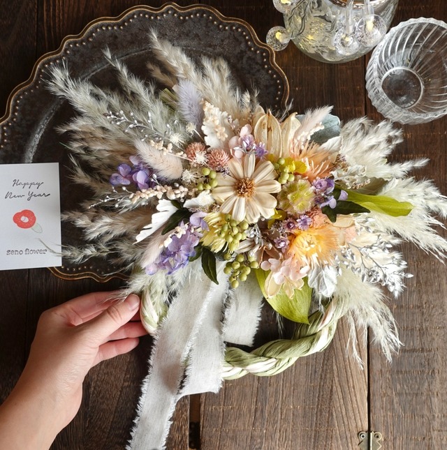 年末まで送料無料! 12/27の14時までのご注文で最短翌日配送です 東京都からのお届けになります。 ※遠方の場合、2-3日いただきます。 【12/23で定形外郵便の発送は終了しました】 ーーーーーーーーーーーーーーーー ⭐︎トップの【ご注文の前に】を一読ください。 ※お一つずつでの販売です。 他商品や他のラインナップカラーが並ぶ写真は 大きさ比較のため掲載しています。 ーーーーーーーーーーーーーーー お正月飾り2026です。 毎年完売seno人気NO.1のお飾りシリーズです。 うさぎの耳のようにも見えるタイサンボクをトップに 繊細なお花をぎゅっと集めたこだわりのお飾りとなっています。 中サイズのお正月飾りよりも大きいサイズで おうちの玄関を華やかに彩り非常に縁起の良いお飾りとなっています。 広がったパンパスグラスは自家製のもので、 今年は染色をしてお花の色に合わせて仕上げました。 洋風なお正月飾りでクリスマスも兼用で長く使えるお飾りです。 年末のご挨拶ギフトにも重宝されています。 ーーーーーーーーーーーーーーーーー 大きさおよそ(個体差あり) 横の長さ約16cm 縦の長さ約37cm ーーーーーーーーーーーーーーーー senoフラワーについて ドライフラワーとプリザーブドフラワーをミックスしたお品です。 自然本来の色や形が残りやすいお花は ドライフラワーで。 変色しやすい花材は高価なプリザーブド加工されたお花を。 手にとって下さったお客様が少しでも長く楽しんでもらように 退色しにくい花材で仕上げるよう心がけています。 ○植物は実物と写真とで違いが出てくることもございます。光の加減にもよりますが、実物の方が柔らかい色合いをしていることが多いです。なるべく現物と近くなるよう写真を撮っていますが、全く同じにすることが難しいお品もございます。 また、土台のしめ飾りは職人による手作り品のため 個体差があり、多少の傾きや歪さがあるものもございます。どうかご理解いただけると幸いです。 ーーーーーーーーーーーーーーーーー ○お花の取り扱いについて ・花達は直射日光や湿気が苦手です。カビの原因となる埃も優しく振り落としてあげてください。 ・大変デリケートなお品物となります。 配送中の衝撃で花びらが落ちる事もあります。ご了承ください。 ・生花より楽しんでいただける時間は長いですが、もちろん寿命もあります。 その変化も合わせてお楽しみください。 ーーーーーーーーーーーーーー ○発送について 透明なセロハンに薄用紙と簡単なラッピングを施してあります。緩衝材に包みダンボールに入れての配送です。