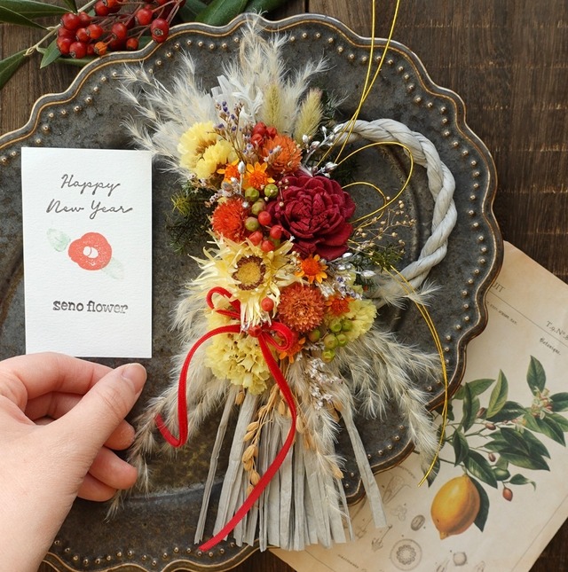 【12/23で定形外郵便の発送は終了しました】 宅急便コンパクトで発送します。 送料のご負担を少しでも減らすために お花を少し押し気味で蓋を閉じます。 到着して、袋からしばらく出して置くと ゆっくりと戻りますのでご理解ください。 ーーーーーーーーーーーーーーーー トップの【ご注文の前に】を一読ください。 ※お一つずつでの販売です。 他商品や他のラインナップカラーが並ぶ写真は 大きさ比較のため掲載しています。 ーーーーーーーーーーーーーーー お正月飾り2026です。 プチお正月飾りよりも少し大きめのお飾りです。 横に広がったパンパスグラスは自家製のもので、 今年は染色をしてお花の色に合わせて仕上げました。 洋風なお正月飾りでクリスマスも兼用で長く使えるお飾りです。 ちょっとしたギフトにも重宝されています。 ーーーーーーーーーーーーーーーーー 大きさおよそ(個体差あり) 横の長さ約18-20cm 縦の長さ約15cm ーーーーーーーーーーーーーーーー senoフラワーについて ドライフラワーとプリザーブドフラワーをミックスしたお品です。 自然本来の色や形が残りやすいお花は ドライフラワーで。 変色しやすい花材は高価なプリザーブド加工されたお花を。 手にとって下さったお客様が少しでも長く楽しんでもらように 退色しにくい花材で仕上げるよう心がけています。 ○植物は実物と写真とで違いが出てくることもございます。光の加減にもよりますが、実物の方が柔らかい色合いをしていることが多いです。なるべく現物と近くなるよう写真を撮っていますが、全く同じにすることが難しいお品もございます。 また、土台のしめ飾りは職人による手作り品のため 個体差があり、多少の傾きや歪さがあるものもございます。どうかご理解いただけると幸いです。 ーーーーーーーーーーーーーーーーー ○お花の取り扱いについて ・花達は直射日光や湿気が苦手です。カビの原因となる埃も優しく振り落としてあげてください。 ・大変デリケートなお品物となります。 配送中の衝撃で花びらが落ちる事もあります。ご了承ください。 ・生花より楽しんでいただける時間は長いですが、もちろん寿命もあります。 その変化も合わせてお楽しみください。 ーーーーーーーーーーーーーー ○発送について 透明なセロハンに薄用紙と簡単なラッピングを施してあります。緩衝材に包みダンボールに入れての配送です。 ・お品物は大変デリケートなもので追跡、壊れ物配送ができる宅配便(宅急便コンパクト)がおすすめです。定形外郵便(切手を貼った郵便物扱い)で起きた事故、破損等の補償はできませんのでご容赦の上、選択ください。