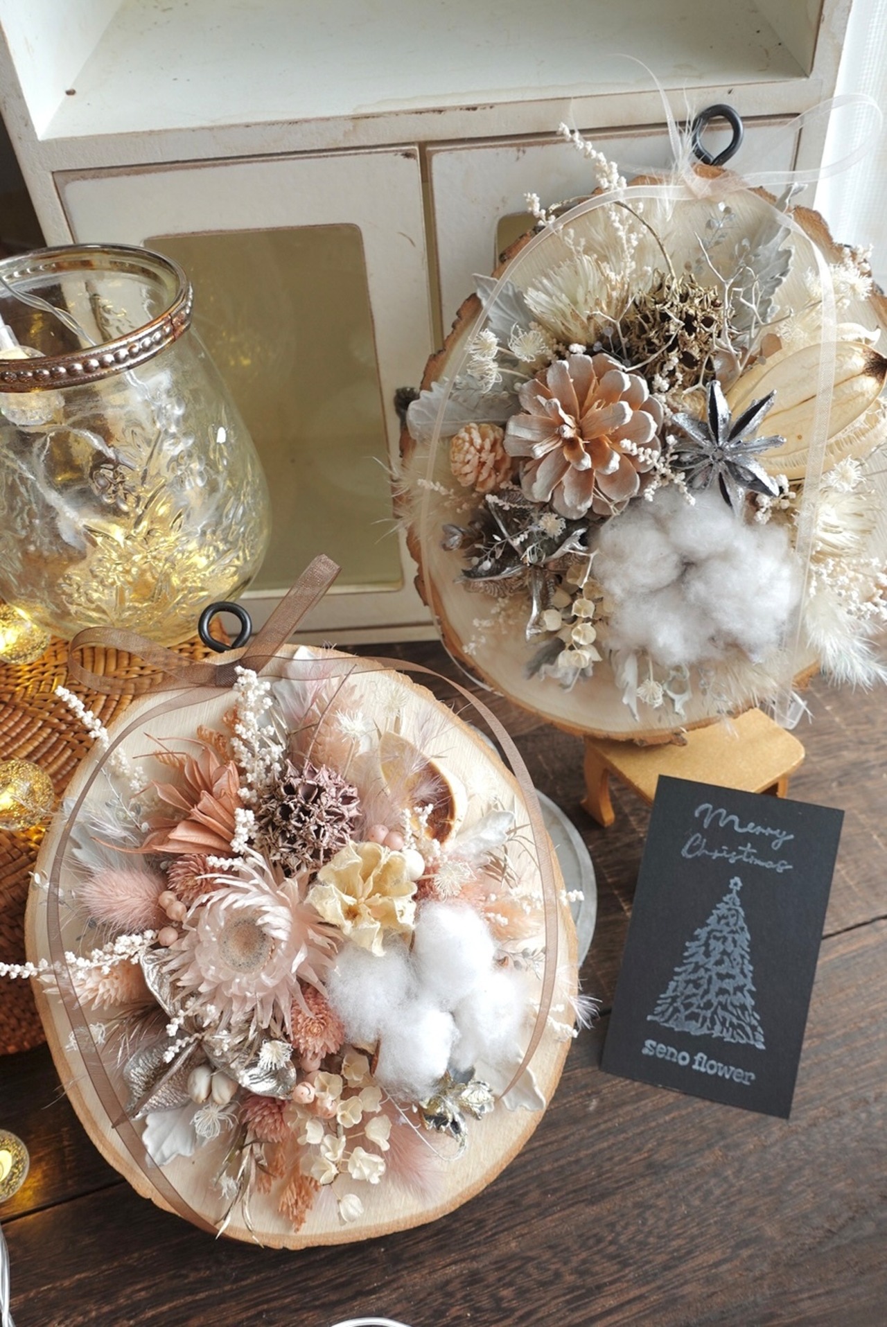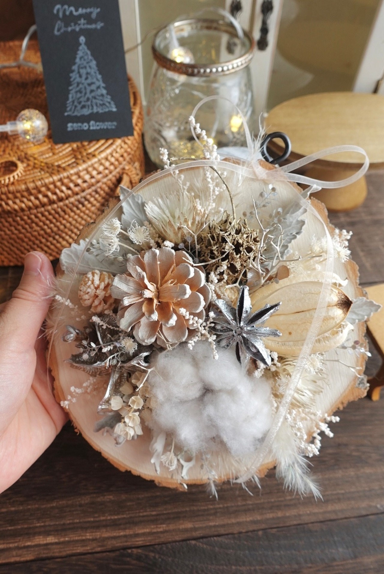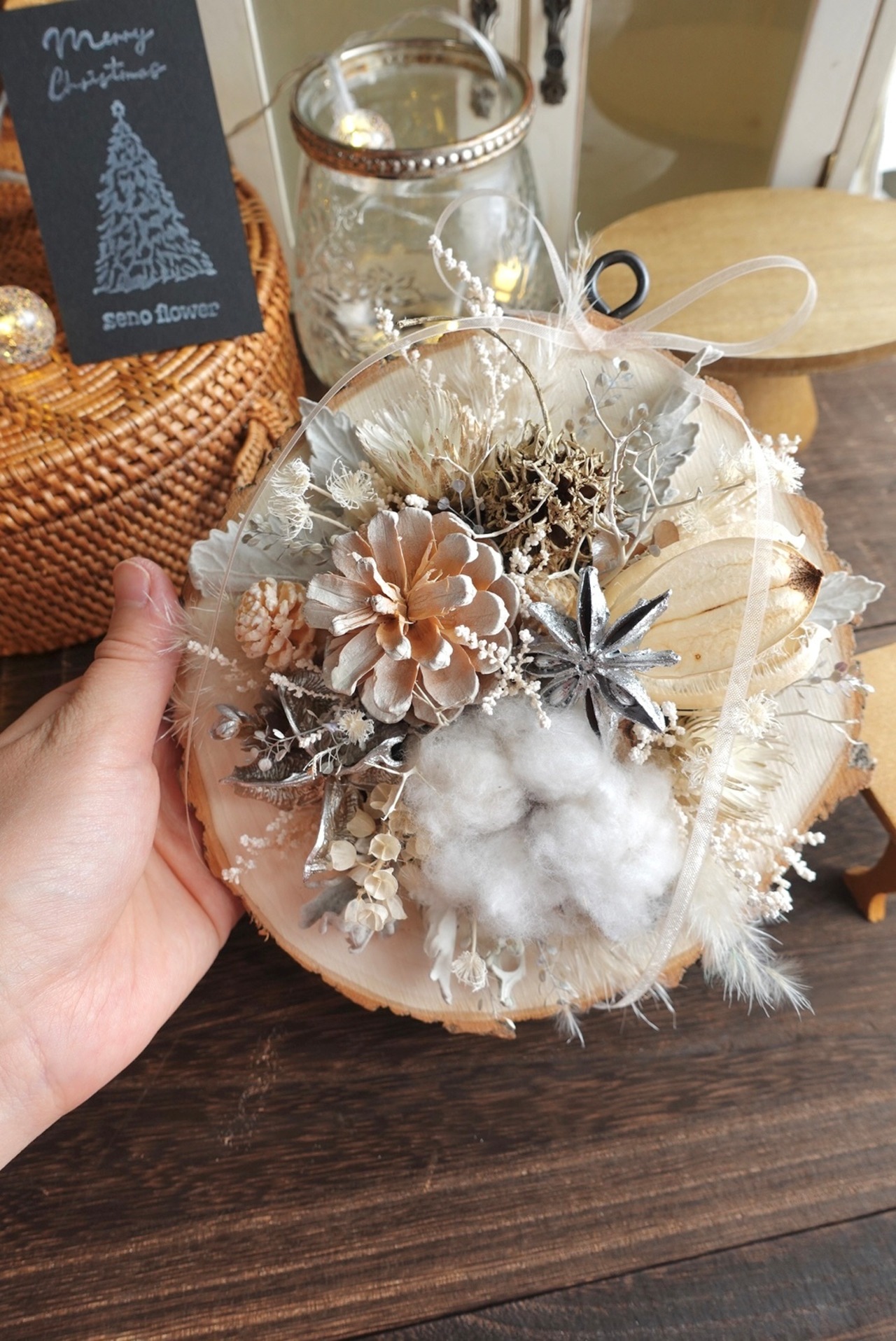 切り株に見立てた木にドライフラワーを施した