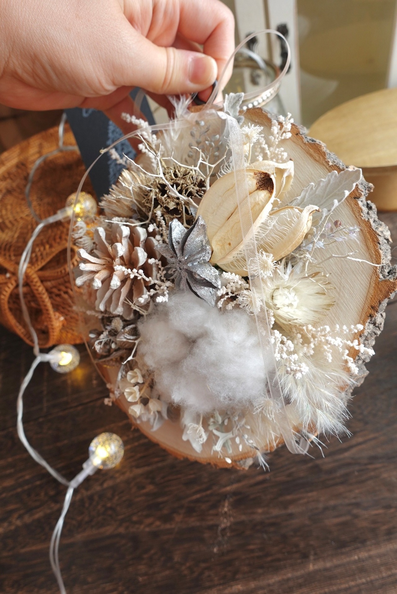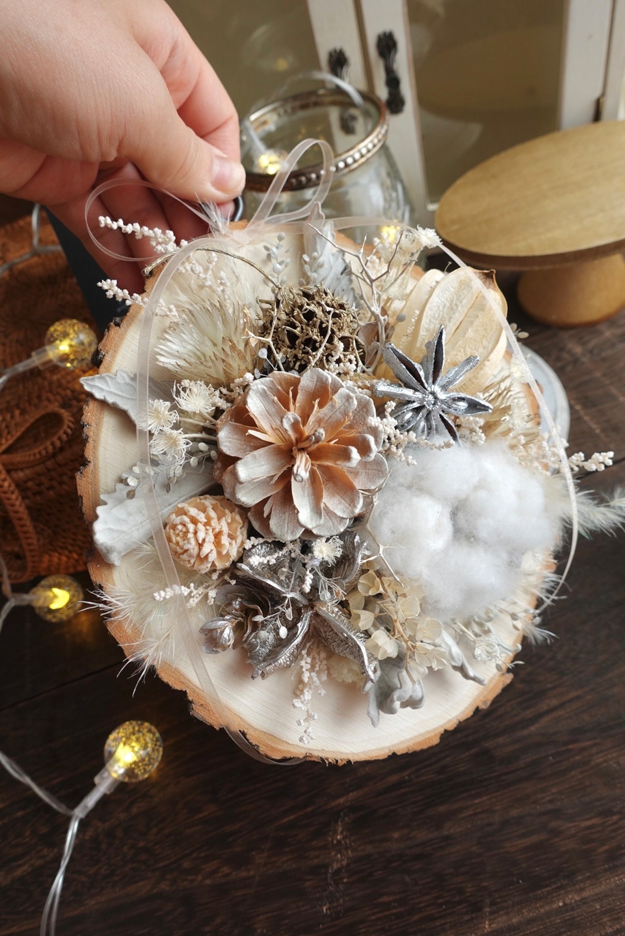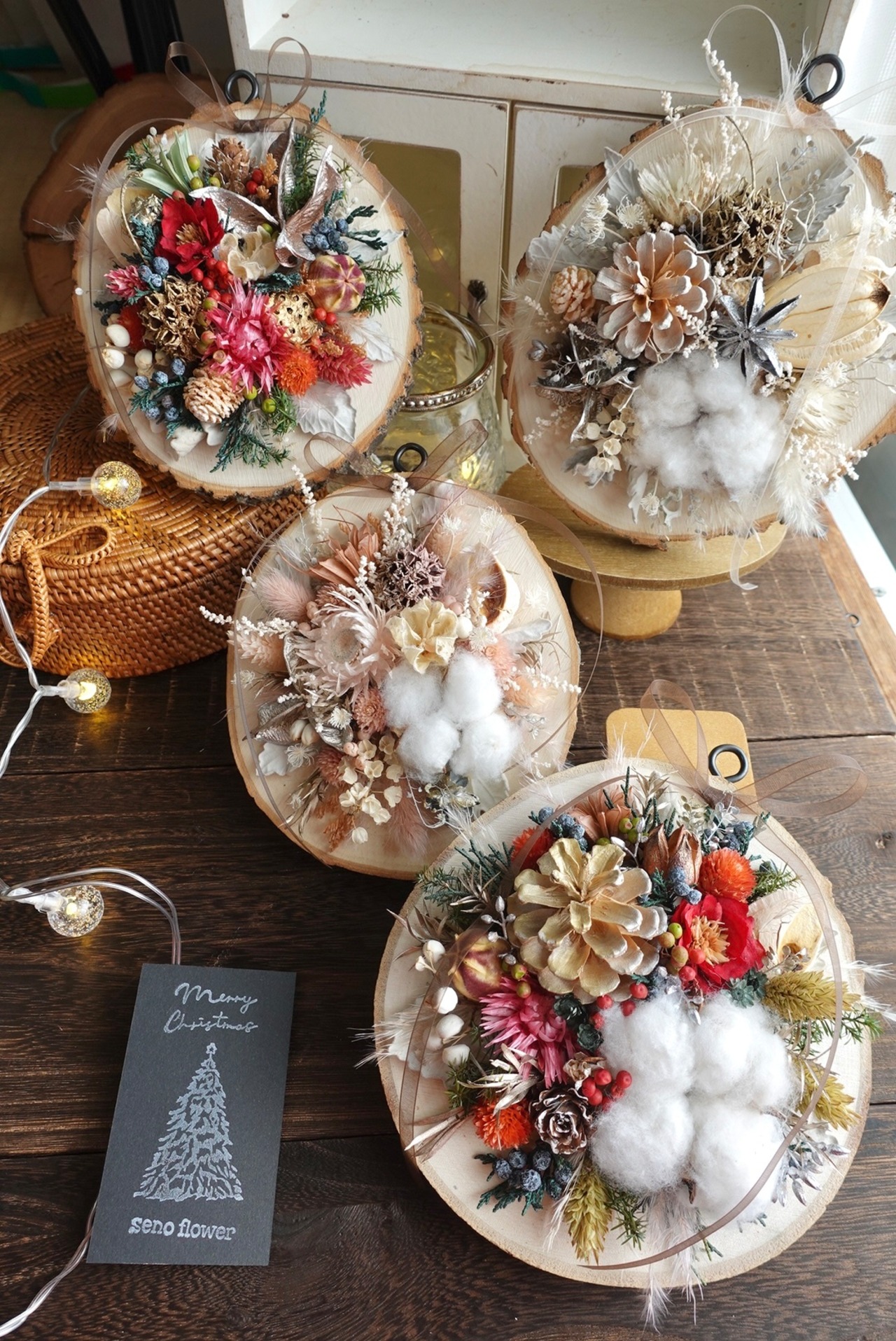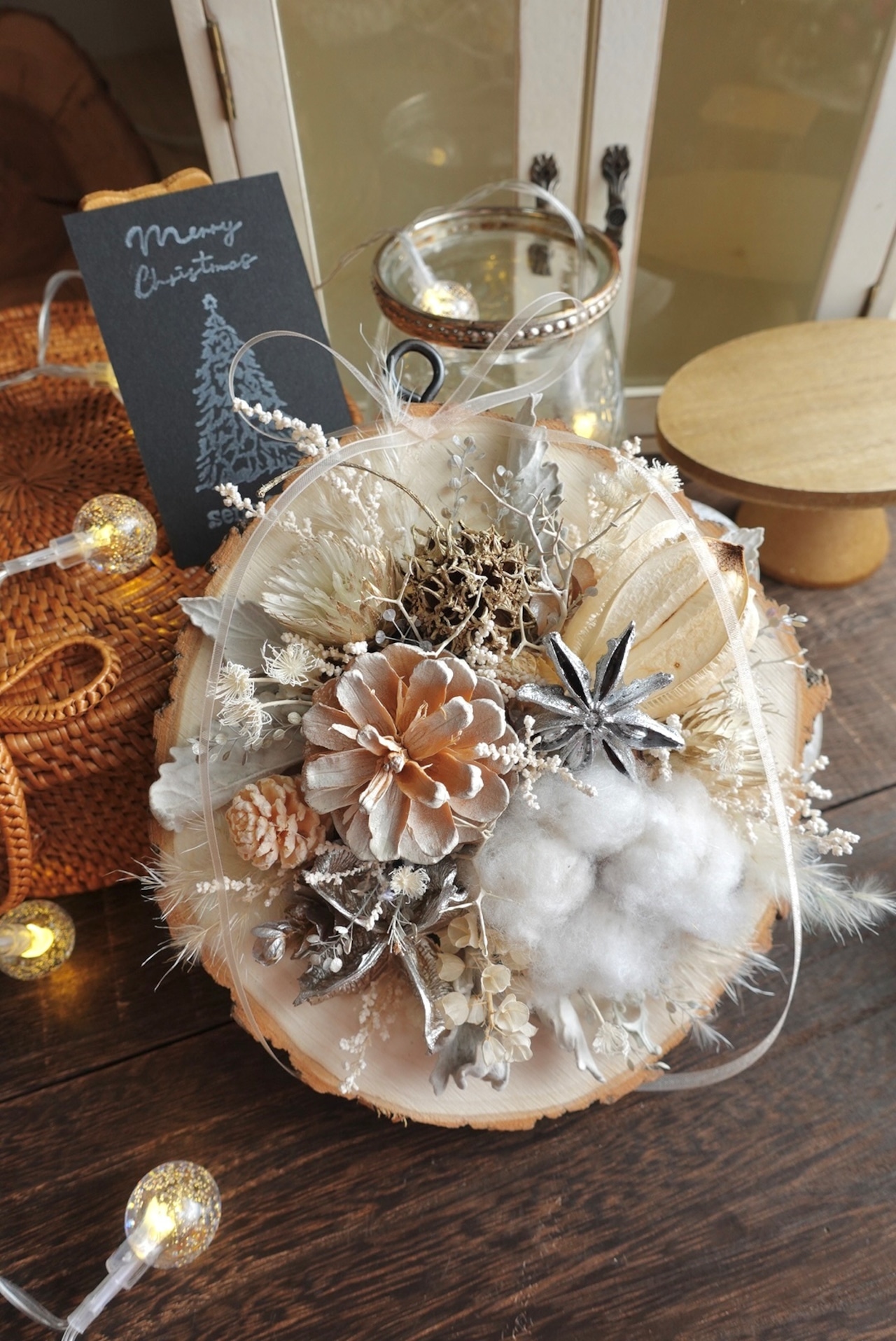 切り株に見立てた木にドライフラワーを施した