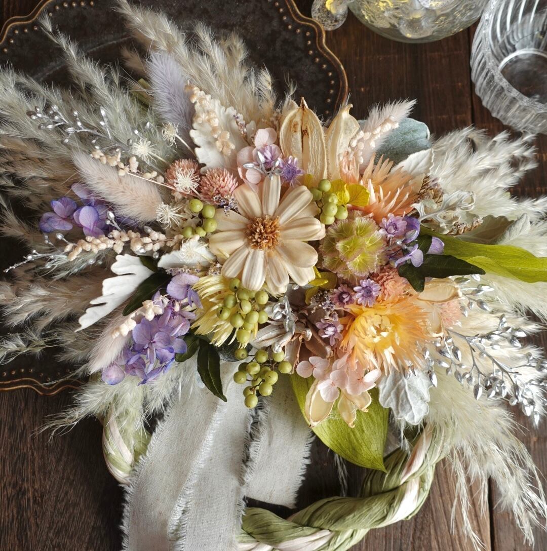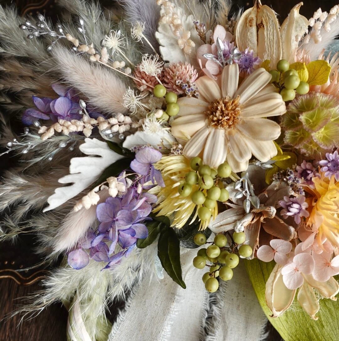手にとって下さったお客様が少しでも長く楽しんでもらように 退色しにくい花材で仕上げるよう心がけています。